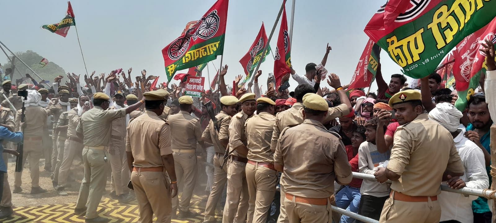 आजमगढ़ जनपद में एक बार फिर अखिलेश की जनसभा में कार्यकर्ताओं ने हंगामा किया। जिसके कारण कार्यक्रम स्थल पर भगदड़ मच गई। कार्यकर्ताओं ने वहां लगे पर्दों को फाड़ दिया। इसके बाद पुलिस ने जब उन पर लाठियां बरसाईं तो उन्होंने पुलिस पर पत्थर भी फेंके। किसी तरह से मामला शांत हुआ।